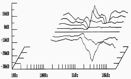 Fig. 4 shows the manner in which the speaker's tonal balance changes as the listener moves to its side- (Only the changes are shown, which means that the on-axis response appears to be a straight line- every speaker designer wishes!) The first thing to note from this graph is that the on-axis suckout fills in off-axis. This is probably why RD was not bothered by any nasal coloration due to the peak/adjacent dip: the dip would only be heard on axis; in a typical room, the reverberant soundfield-- which also contributes to a speaker's perceived balance-- would not have the dip. However, note that the peak accentuates for extreme off-axis angles as the region below-the center of the dipole midrange's passband-nulls out and the region above, handled by the tweeter, increasingly rolls off Reflections of the speaker's sound from the sidewalls will be too bright, therefore, and will exacerbate the propensity of the on-axis peak to give the sound somewhat of an "etched" quality. Experimenting with rugs or diffusing surfaces on the sidewalls will be a good idea with this speaker.